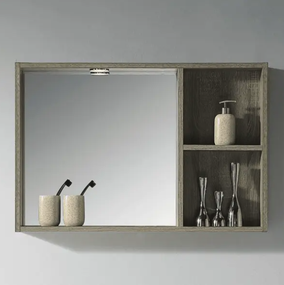 MIDI series shaving mirror, MD-90S, matches well with MIO or MI series of 90cm vanity in design, colour & size. With its two-layer side shelf at right or left, it creates an additional convenient space for your daily essential beauty products. This horizontal mirror in an 18mm woodgrain plywood frame used the best quality copper-free mirror will be a talking point of your bathroom.
