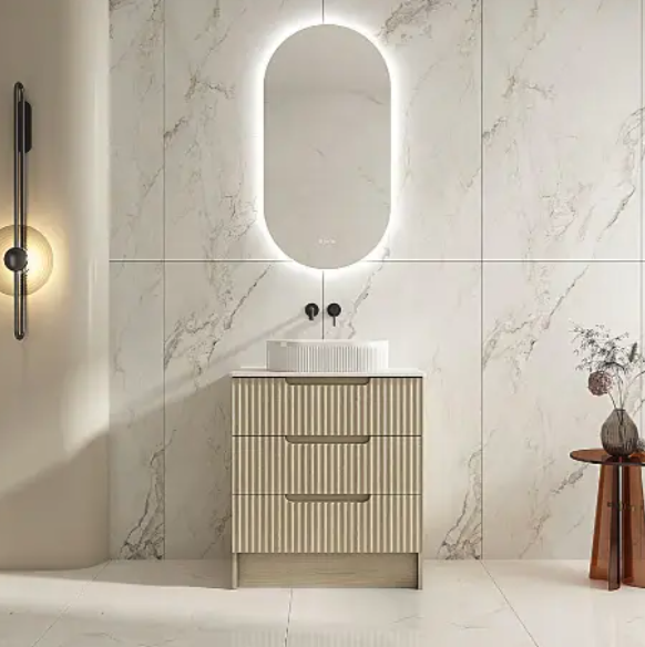 Upgrade your bathroom with the Fluted Rhea Vanity, a stylish and functional addition to any modern space. Featuring a 750mm freestanding cabinet in a Natural Oak finish, it seamlessly blends aesthetic appeal with practical storage, making it an ideal choice for contemporary bathroom designs. The sleek and minimalist design, with a three-door finger pull-to-open mechanism, ensures a seamless, handle-free appearance that enhances both convenience and modern appeal.